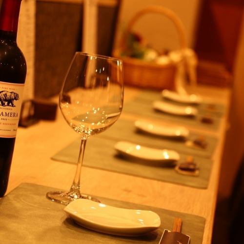 毎月厳選したワインを多数ご用意しております。ジビエ料理に相性の良いものは勿論、あまり他店では取り扱いのないものをご用意しております。イタリア人のバイヤーさんのオススメワインなど愉しんで頂けること間違いなしです。他にも珍しいリキュールもご用意しております。